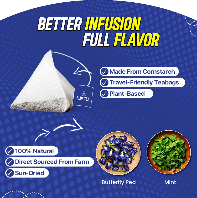 Made from the vibrant petals of the Clitoria Ternatea plant, known as Aparajita in Sanskrit, and infused with refreshing mint, Butterfly Pea Flower Tea is a natural powerhouse of antioxidants.