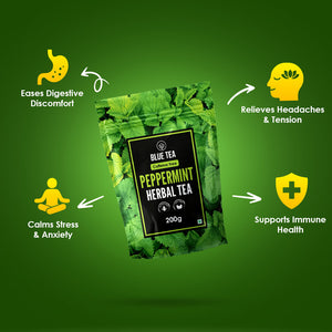 Experience the crisp, cooling comfort of Peppermint Tea, made from 100% pure peppermint leaves. Known for its naturally soothing properties, this refreshing herbal infusion is perfect for calming digestion, easing headaches, and uplifting your mood - all without caffeine.