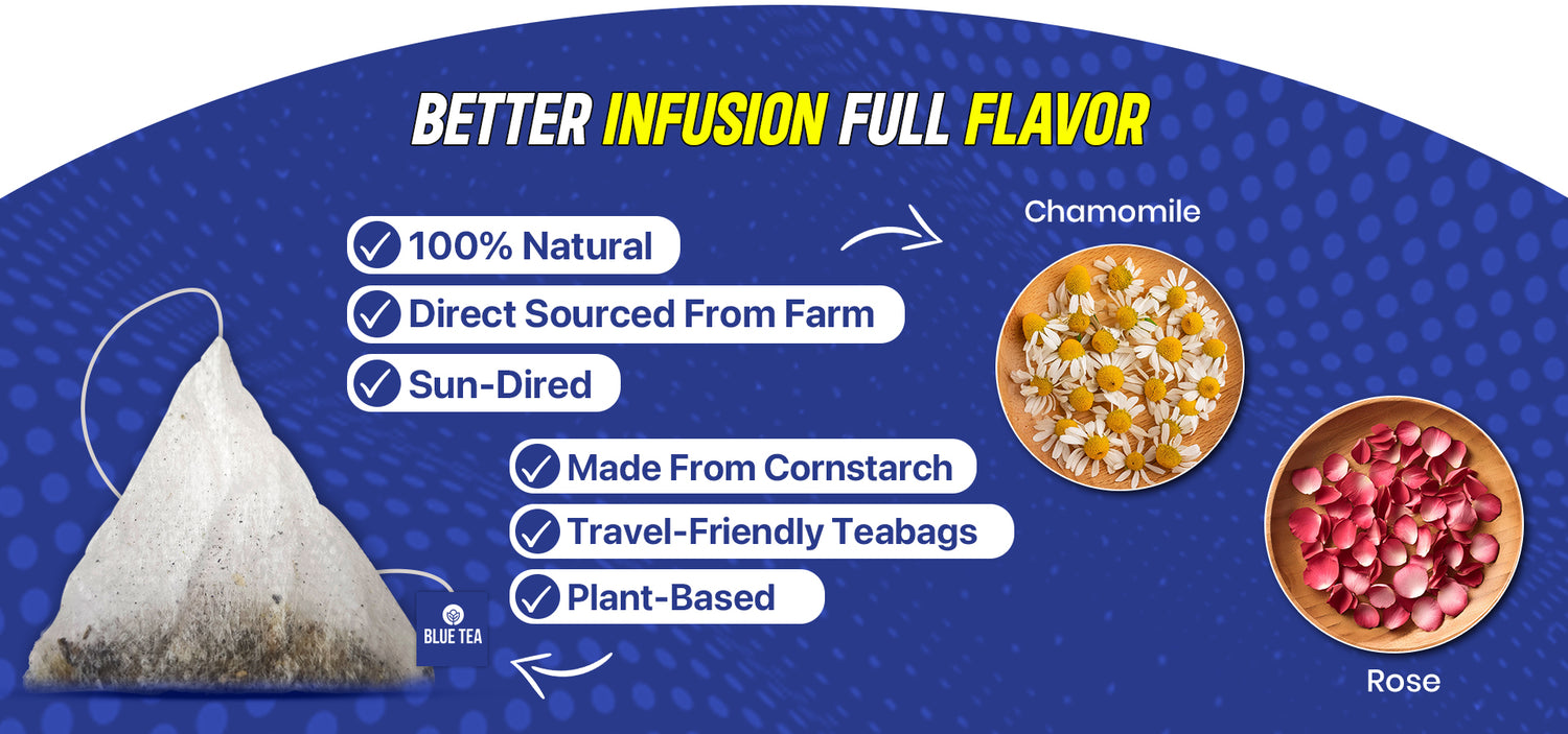 Calm Yourself with our, Chamomile Rose Herbal Tea. These Ayurvedic mix of Flowers are known for its calming effects and are packed fresh from the farms to retain all their nutrition.