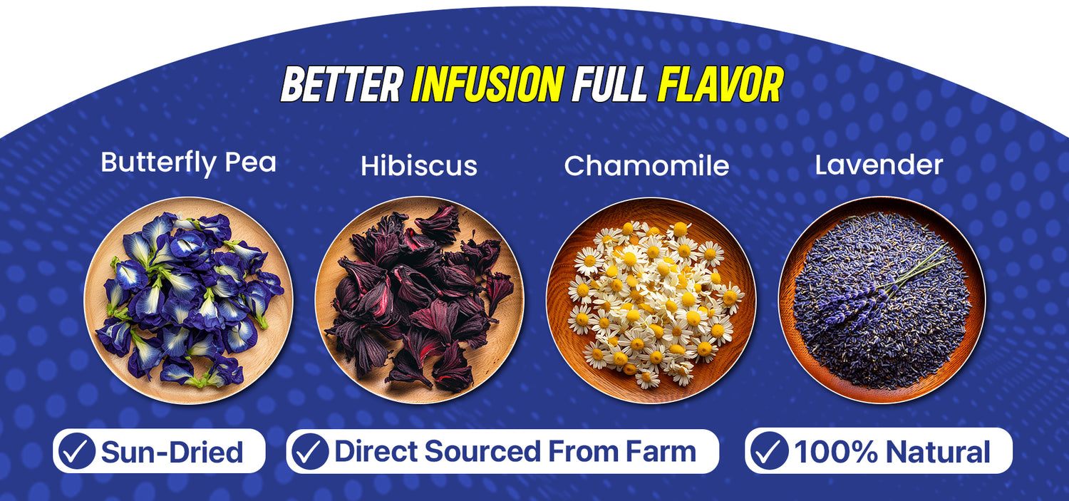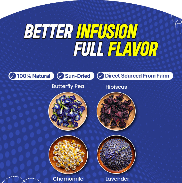 Unlock the essence of complete wellness with this combo of butterfly pea, chamomile, hibiscus, and lavender tea.