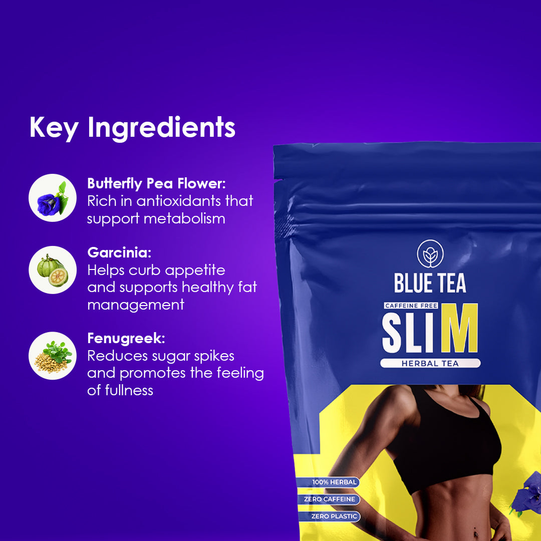 Slim Tea is a potent blend of Butterfly Pea, Garcinia, and fenugreek that supports metabolism, reduces bloating, melts away fat, and flushes out toxins, reinforcing your fitness goals.