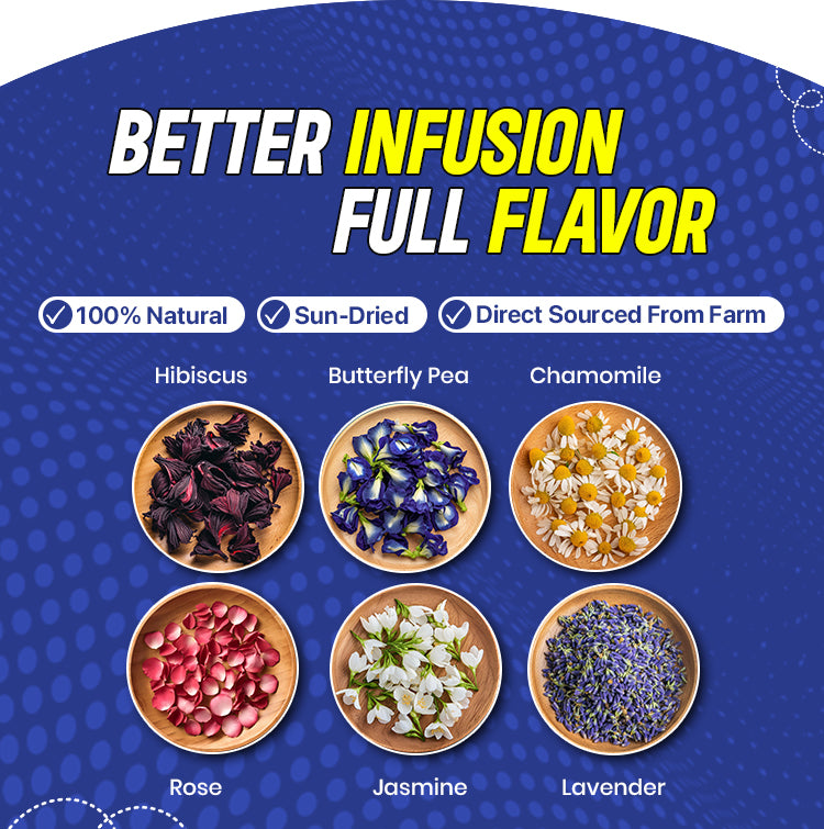 Unlock unparalleled health and wellness with this pack of six herbal blends - Butterfly Pea Flower, Hibiscus, Chamomile, Jasmine, Lavender, & Rose Infusions. These flower-based herbal blends can do everything from energizing your mornings to calming your nerves after a hectic day.
