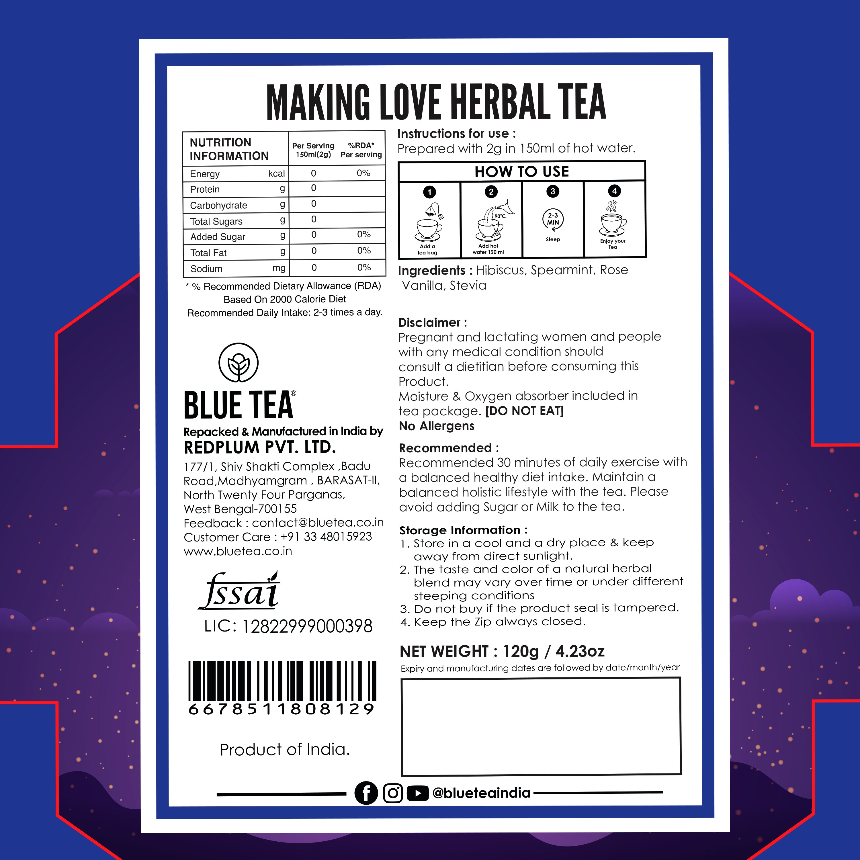 A sensual herbal blend designed to awaken the senses and soothe the soul. Making Love is a passionate blend of exotic botanicals that possess aphrodisiac properties, helping to promote intimacy, relaxation, and enjoyment.
